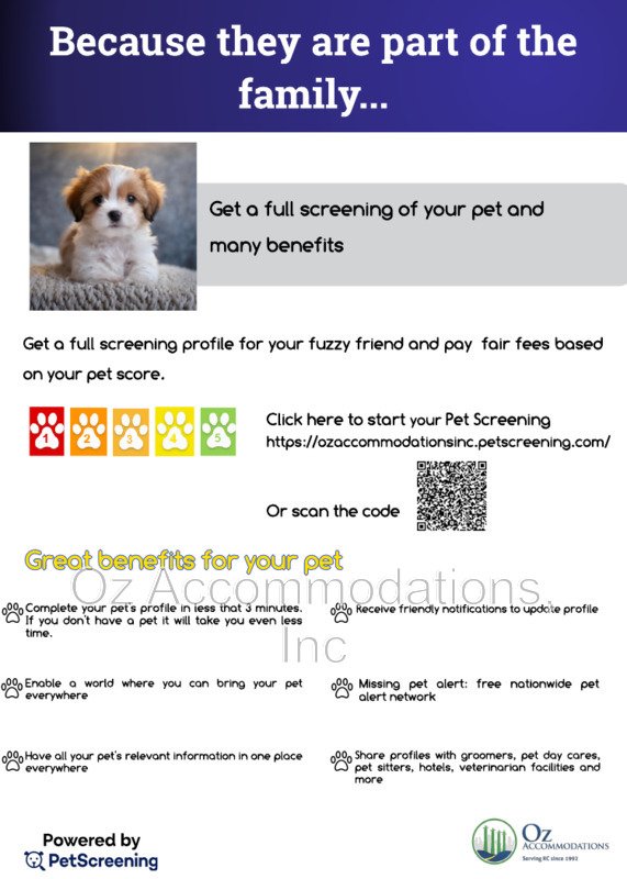 We use a third-party service, PetScreening, to ensure all applicants understand how to adhere to the property's pet and animal policies, even if you do not have a pet or animal. All applicants should complete a Pet, No Pet, or Animal Profile. Please use the QR code provided. Even if you do not currently have a pet, it is essential to fill out the form.